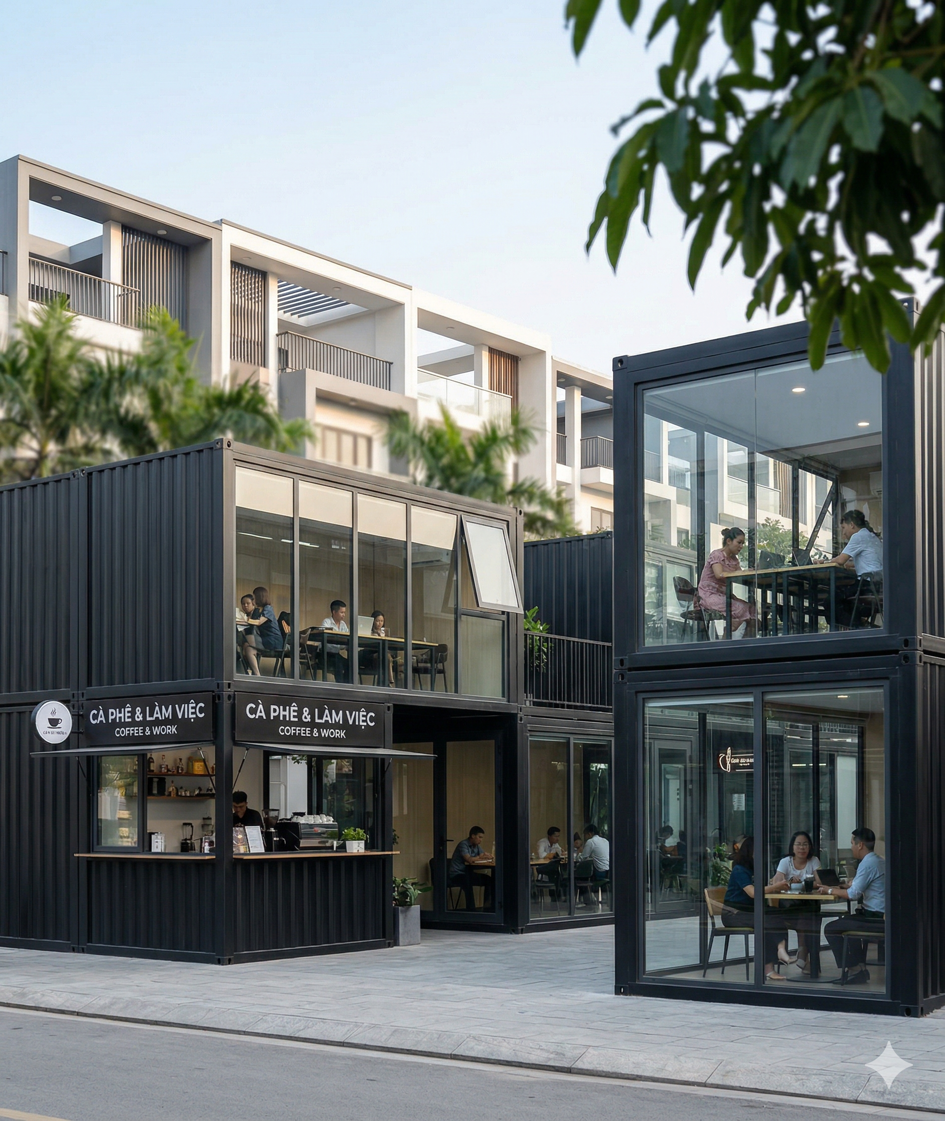 Cải tạo container thành văn phòng độc lập, ki-ốt và các công trình thương mại dạng mô-đun khác. Thiết kế chú trọng tính thẩm mỹ và ứng dụng thực tế, giúp doanh nghiệp triển khai mạng lưới kinh doanh nhanh chóng với chi phí được kiểm soát.